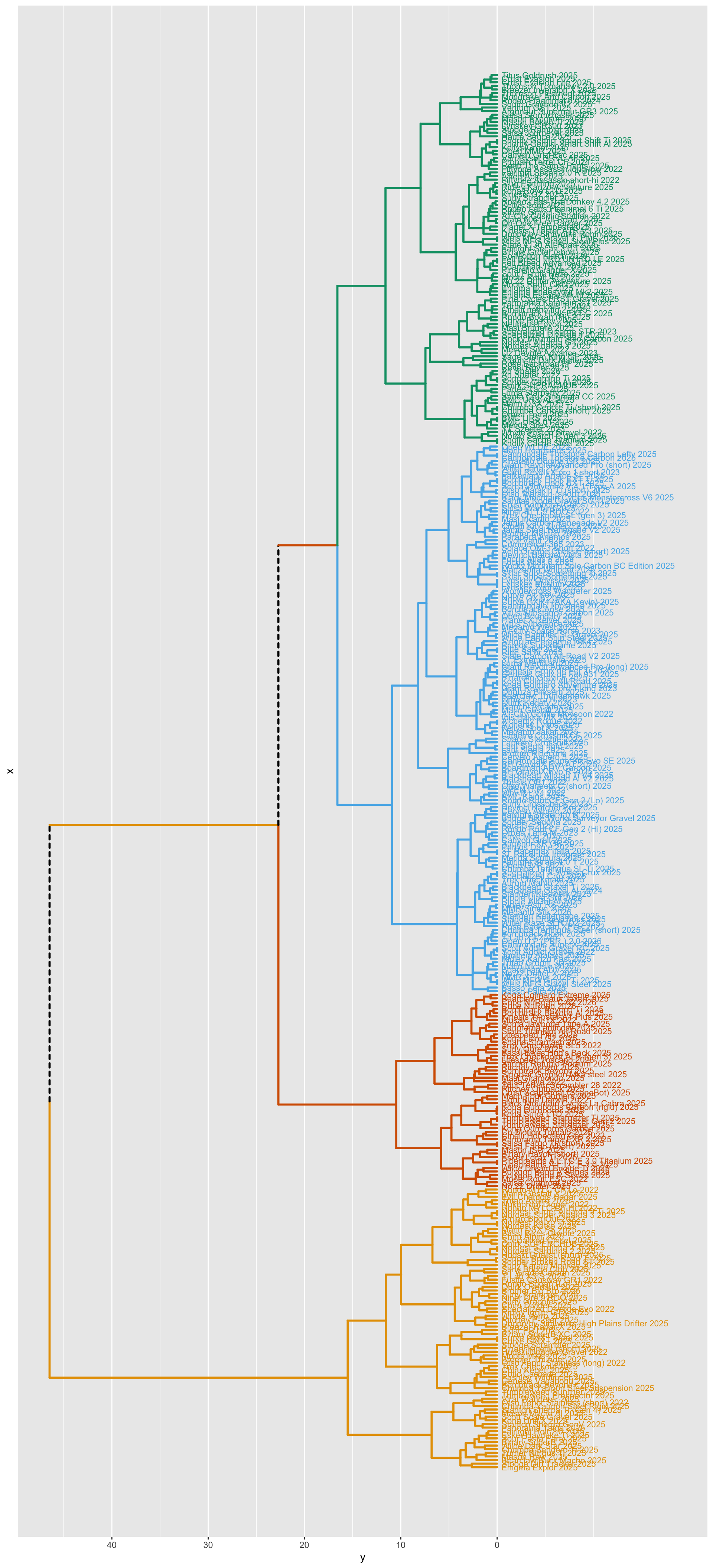 - The tree is based on a frame size that fits a 175 cm high rider (generally frame size M or 54), according to manufacturer’s charts. Splitting the tree into the three major clusters results in a classification that is close to, but not equivalent, to the classification computed using robust k-means (the classification elsewhere on this site).